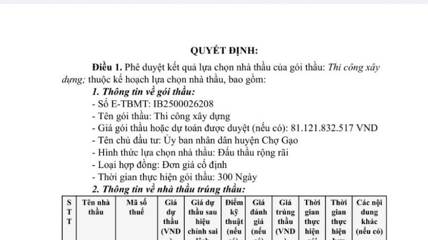 VOV.VN - Liên quan đến việc tổ chức đấu thầu thực hiện dự án xây dựng trụ sở UBND huyện Chợ Gạo và các phòng chức năng, hội trường của huyện này mà VOV thông tin; đến nay UBND huyện Chợ Gạo đã phê duyệt kết quả lựa chọn nhà thầu thi công là công ty TNHH Thuận Phú (tại xã Tân Lý Tây, huyện Châu Thành, tỉnh Tiền Giang).
