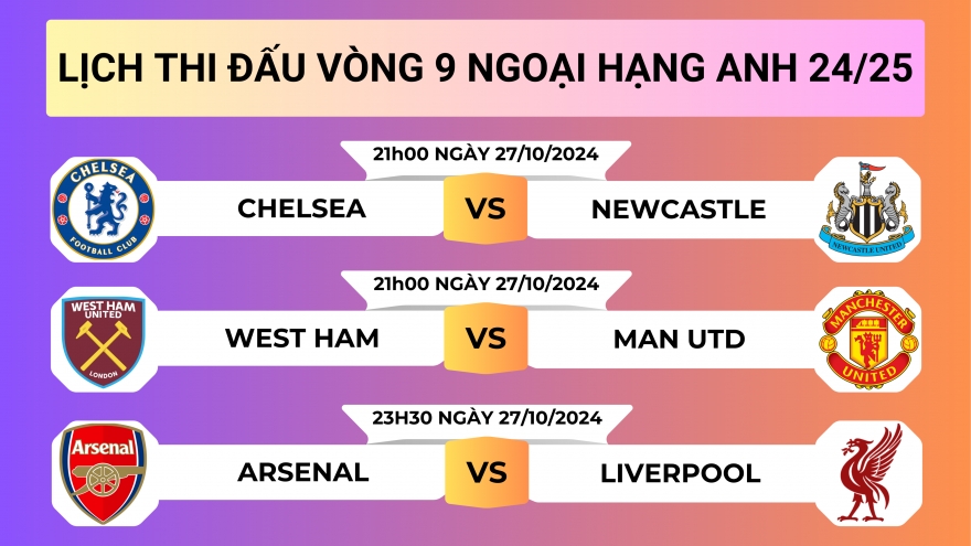 Lịch thi đấu vòng 9 Ngoại hạng Anh 2024/2025: Arsenal đại chiến Liverpool