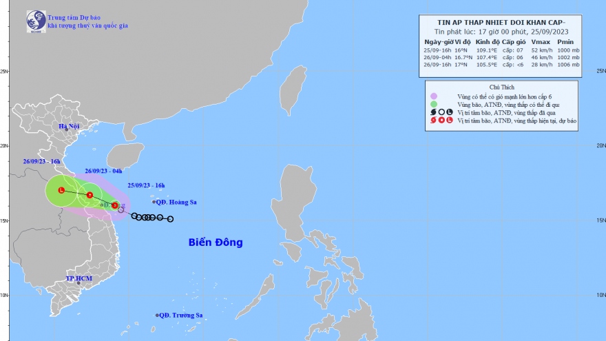 VOV.VN - Do ảnh hưởng hoàn lưu của áp thấp nhiệt đới nên ở khu vực Bắc và Trung Trung Bộ đã có mưa vừa, mưa to, có nơi mưa rất to. Lượng mưa tính từ 00h ngày 25/9 đến 16h ngày 25/9 phổ biến 50-100mm, cục bộ một số nơi trên 150mm như: Hội An (Quảng Nam) 205,8mm; Đà Nẵng 215mm; Hương Phú (Thừa Thiên Huế) 299mm; Triệu Ái (Quảng Trị) 205mm...