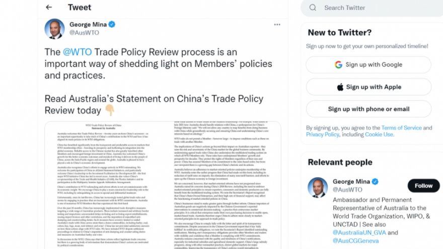VOV.VN - Hôm qua, phái đoàn Australia tại Tổ chức thương mại thế giới đã ra tuyên bố trong đó cho rằng Trung Quốc đang đe dọa hệ thống thương mại toàn cầu. Thực tế này cho thấy quan hệ giữa Australia và Trung Quốc vẫn chưa thể sớm cải thiện.