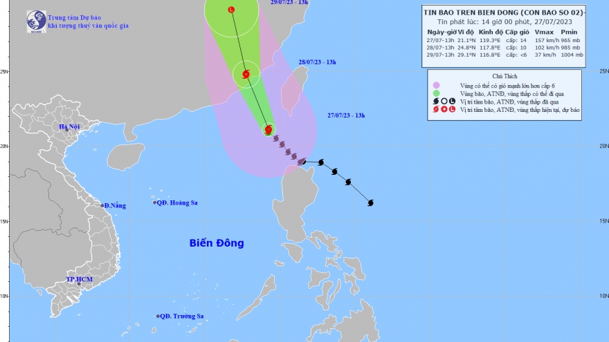VOV.VN - Theo Trung tâm dự báo khí tượng thủy văn quốc gia, hồi 13 giờ ngày 27/7, vị trí tâm bão ở vào khoảng 21,1 độ Vĩ Bắc; 119,3 độ Kinh Đông, cách Sán Đầu (Trung Quốc) khoảng 370km về phía Nam Đông Nam.