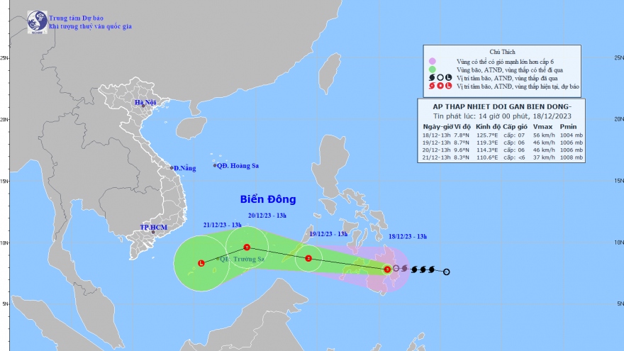 VOV.VN - Theo Trung tâm dự báo Khí tượng Thủy văn quốc gia, hồi 13 giờ ngày 18/12, vị trí tâm áp thấp nhiệt đới ở vào khoảng 7,8 độ Vĩ Bắc; 125,7 độ Kinh Đông, trên đất liền miền Nam Philippines.