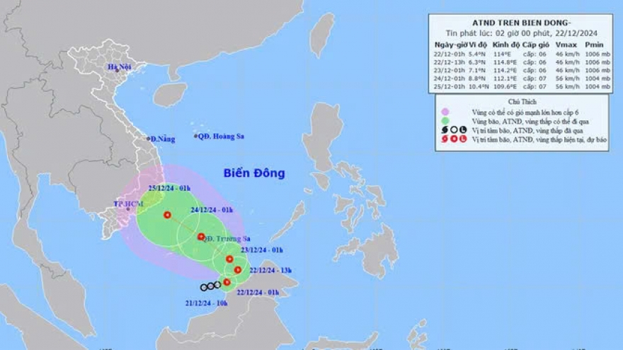 VOV.VN - Hồi 07 giờ ngày 22/12, vị trí tâm áp thấp nhiệt đới ở vào khoảng 6,0 độ Vĩ Bắc; 115,0 độ Kinh Đông, trên vùng biển phía Nam của khu vực Nam Biển Đông. Sức gió mạnh nhất vùng gần tâm áp thấp nhiệt đới mạnh cấp 6 (39-49km/h), giật cấp 8.