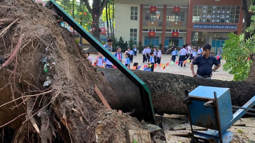 Cây cổ thụ bật gốc đổ rạp trong sân trường tiểu học ở Đồng Nai