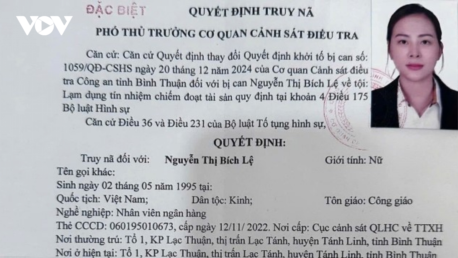 VOV.VN - Đồng Ngọc Thuận bị Cơ quan CSĐT, Công an Dĩ An (Bình Dương) truy nã về tội "Lạm dụng tín nhiệm chiếm đoạt tài sản" vừa bị bắt khi đang lẩn trốn tại tỉnh Bình Thuận.