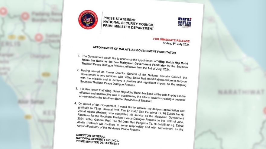 VOV.VN - Malaysia đã bổ nhiệm ông Datuk Mohd Rabin Basir, cựu lãnh đạo Hội đồng An ninh quốc gia Malaysia (MKN), làm trưởng đại diện mới của Chính phủ nước này trong các cuộc đàm phán hòa bình ở miền Nam Thái Lan kể từ ngày 1/7.