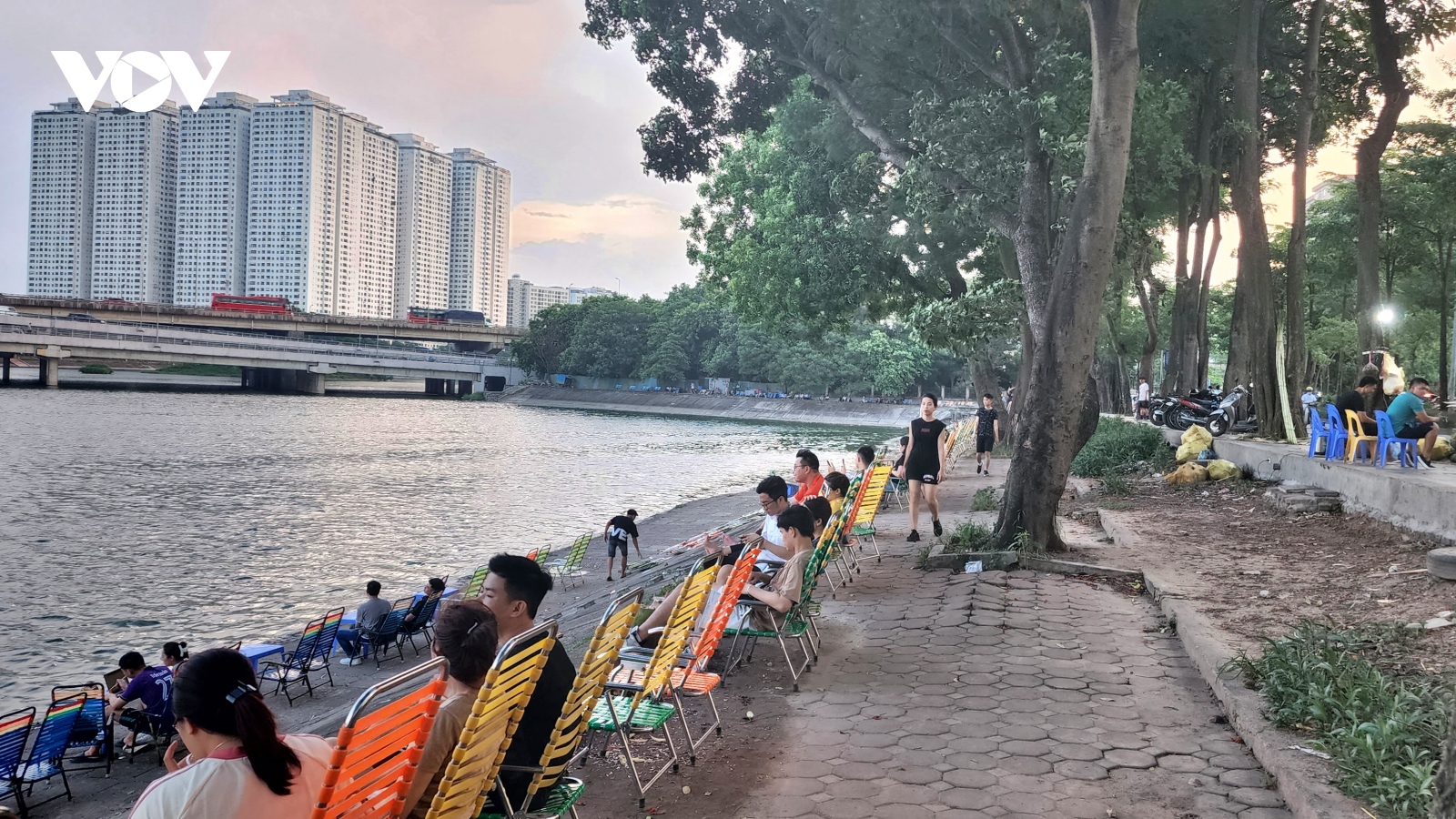 VOV.VN - Sau quãng thời gian cao điểm lập lại trật tự đô thị, đến nay chỗ vui chơi, thể dục của người dân tại bờ kè hồ Linh Đàm (quận Hoàng Mai, Hà Nội) lại bị hàng quán bán nước giải khát lấn chiếm.
