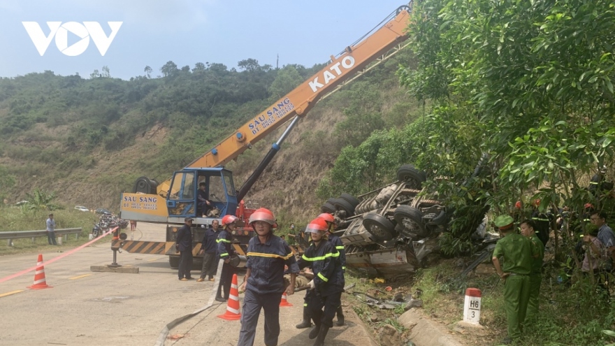 VOV.VN - Xe tải chở dưa qua đoạn đường đèo thuộc thôn Phú Long, xã An Mỹ, huyện Tuy An, tỉnh Phú Yên thì bị lật vào vách núi khiến 4 người tử vong tại chỗ, nhiều người bị thương nặng và mắc kẹt trong xe.