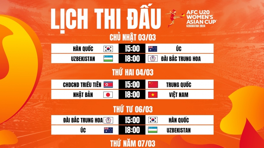 VOV.VN - Cập nhật lịch thi đấu và trực tiếp U20 nữ Việt Nam tại VCK U20 châu Á 2024 diễn ra tại Uzbekistan. U20 nữ Việt Nam so tài với những đối thủ rất mạnh.