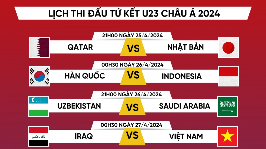 VOV.VN - Kết thúc vòng bảng U23 châu Á 2024, Ban tổ chức xác định được 8 đội bóng đi tiếp và 4 cặp tứ kết. U23 Việt Nam sẽ gặp U23 Iraq ở tứ kết U23 châu Á 2024.