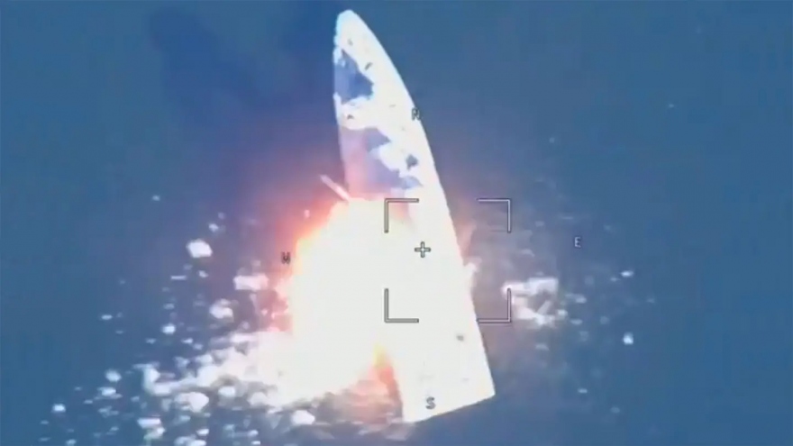 VOV.VN - Đoạn video được Sputnik đăng tải ngày 5/11 cho thấy UAV cảm tử Lancet tấn công tàu pháo Gyurza-M trên sông Dnepr. Tàu pháo Ukraine bị UAV trinh sát Nga theo dõi khi đang ở trạng thái đứng yên. UAV Lancet lao đến từ phía sau, đánh trúng vị trí bên trái buồng chỉ huy và cột radar của tàu pháo.