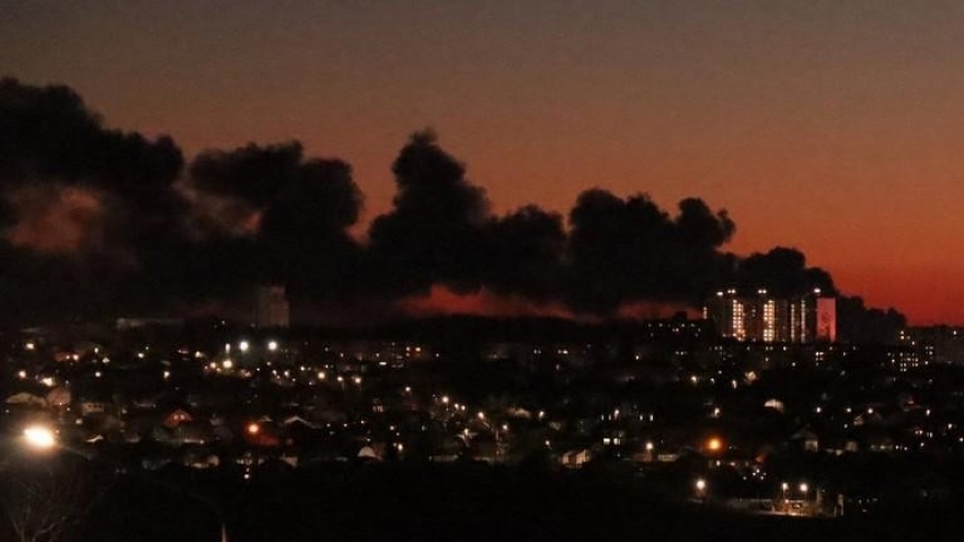 VOV.VN - Truyền thông Nga ngày 6/12 đã công bố video về hậu quả của vụ tấn công bằng máy bay không người lái (UAV) vào một sân bay ở vùng Kursk của Nga, giáp biên giới với Ukraine. Vụ tấn công khiến một bể chứa dầu bốc cháy dữ dội, lửa và khói đen bốc lên nghi ngút.