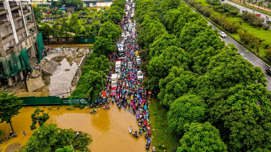 VOV.VN - Sáng 23/5, tại đường gom Đại lộ Thăng Long, đoạn qua khu đô thị Thiên Đường Bảo Sơn (huyện Hoài Đức, Hà Nội), nhiều xe cộ, đặc biệt là ô tô, phải quay đầu vì có nhiều đoạn ngập sâu quá bánh xe.