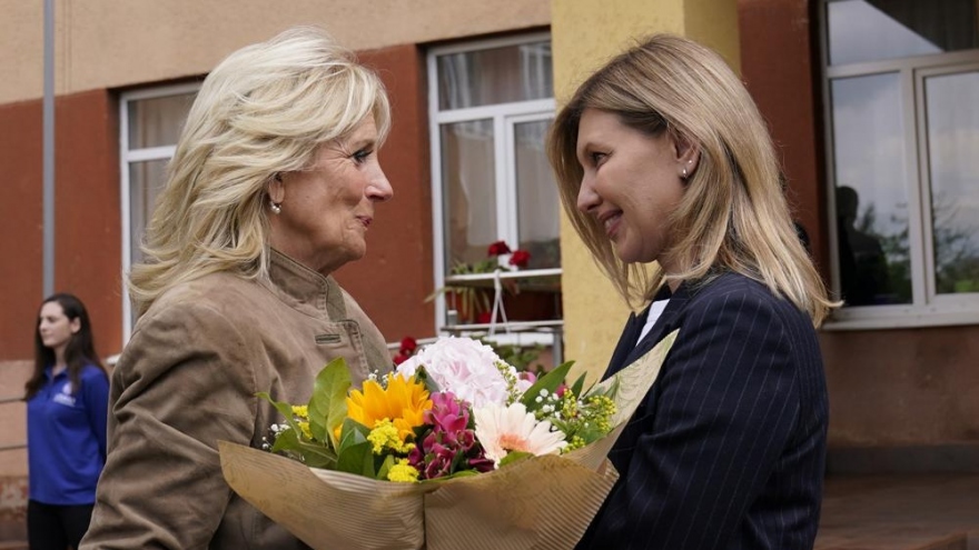 VOV.VN - Đệ nhất phu nhân nước Mỹ - bà Jill Biden bất ngờ thăm miền Tây Ukraine vào hôm 8/5, tổ chức cuộc gặp nhân Ngày của Mẹ với đệ nhất phu nhân Ukraine - bà Olena Zelenska.
