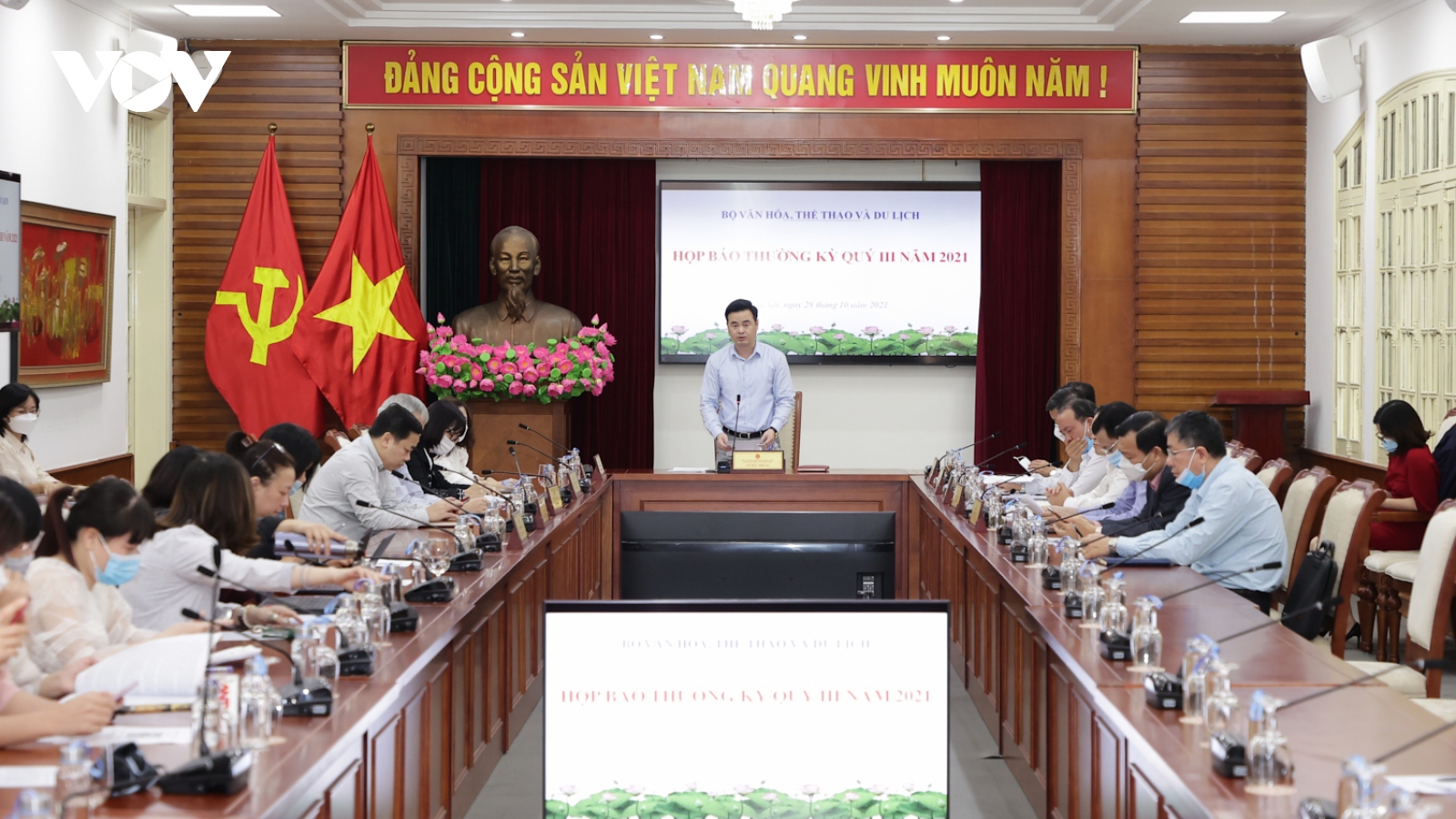 VOV.VN - Sáng 28/10, Bộ Văn hóa, Thể thao và Du lịch (VHTT&DL) đã tổ chức họp báo thường kỳ quý III năm 2021. Ông Lê Đức Trung, Chánh Văn phòng, Người phát ngôn Bộ VHTT&DL chủ trì họp báo.