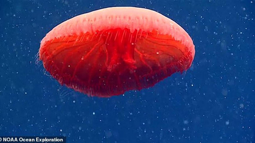 VOV.VN - Các nhà nghiên cứu Mỹ mới đây đã ghi lại được hình ảnh một con sứa đỏ tuyệt đẹp, có cơ thể hình đĩa, chưa từng được phát hiện, ở độ sâu hơn 700m dưới bề mặt Đại Tây Dương.