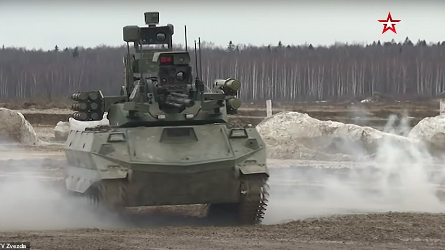 VOV.VN - Trong đoạn video do Bộ Quốc phòng Nga công bố, 2 mẫu xe chiến đấu không người lái đã phô diễn khả năng khai hỏa nhằm vào kẻ thù mô phỏng trong cuộc tập trận quân sự Zapad 2021.