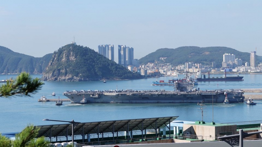 VOV.VN - Nhóm tác chiến sân bay USS Ronald Reagan của Mỹ đã cập cảng Hàn Quốc hôm 23/9, lần đầu tiên sau 4 năm. Động thái này được cho là nhằm răn đe Triều Tiên trong bối cảnh căng thẳng trong khu vực leo thang.