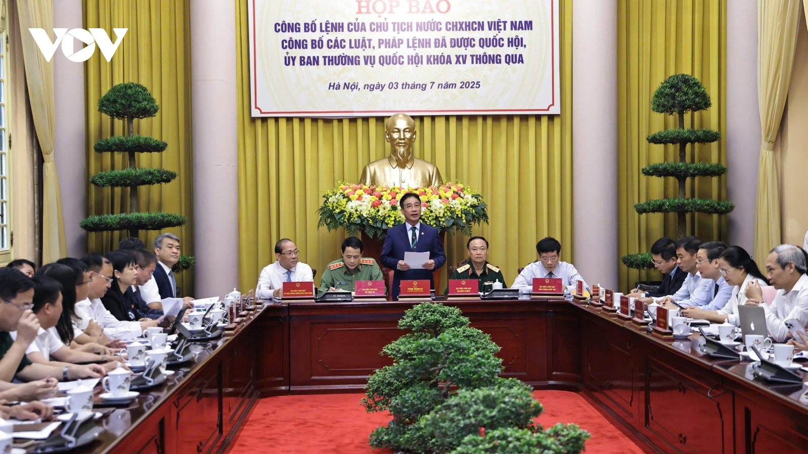 VOV.VN - Ngày 3/6, tại Phủ Chủ tịch, Văn phòng Chủ tịch nước tổ chức họp báo công bố Lệnh của Chủ tịch nước công bố các luật, pháp lệnh đã được Quốc hội, Ủy ban Thường vụ Quốc hội khóa XV thông qua.