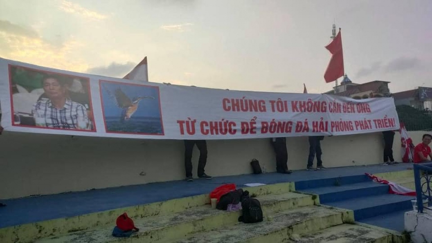 VOV.VN - Quá thất vọng với thành tích gần đây của CLB Hải Phòng, nhiều CĐV đội bóng đất Cảng đã căng băng rôn yêu cầu Chủ tịch đội bóng - ông Trần Mạnh Hùng từ chức.