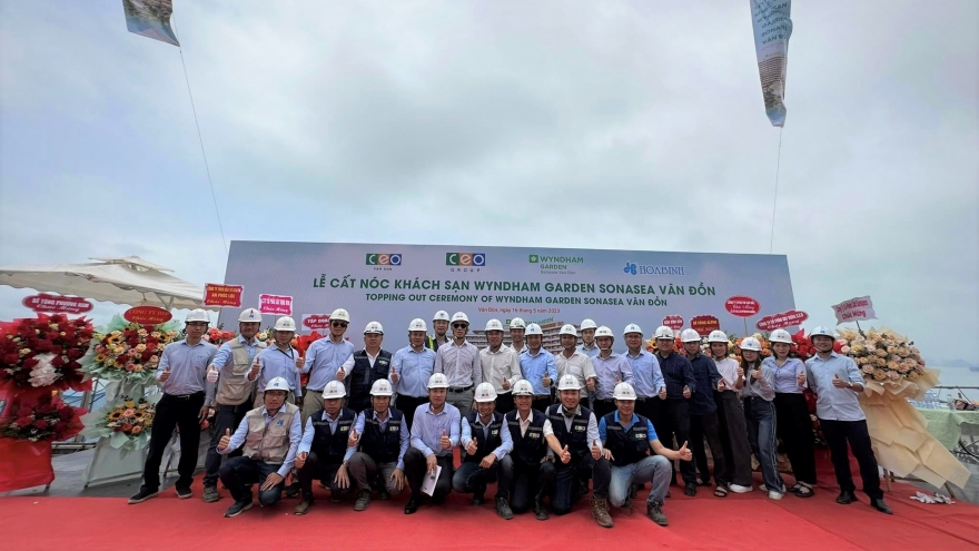 VOV.VN - Sau một năm khởi công, ngày 16/5/2023, Tập đoàn CEO đã tổ chức lễ cất nóc dự án khách sạn Wyndham Garden Sonasea Vân Đồn thuộc dự án khu tổ hợp nghỉ dưỡng Sonasea Vân Đồn Harbor City (Quảng Ninh).