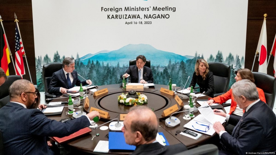 VOV.VN - Trưa nay (18/4), tại Nagano, Nhật Bản, Hội nghị Ngoại trưởng G7 đã bế mạc sau 3 ngày làm việc và ra Tuyên bố chung, trong đó nhấn mạnh đến cuộc xung đột Nga - Ukraine và phản đối hành vi đơn phương thay đổi hiện trạng bằng vũ lực.