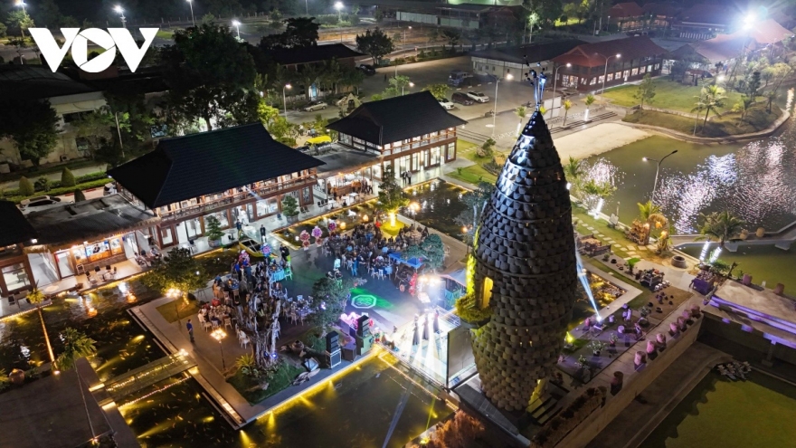 Tháp Thần Nông - biểu tượng cho vị thần của nền văn minh lúa nước được ghép bởi 1.012 cối đá xếp vòng ngoài, bên trong là khung cột bêtông được đổ kiên cố.