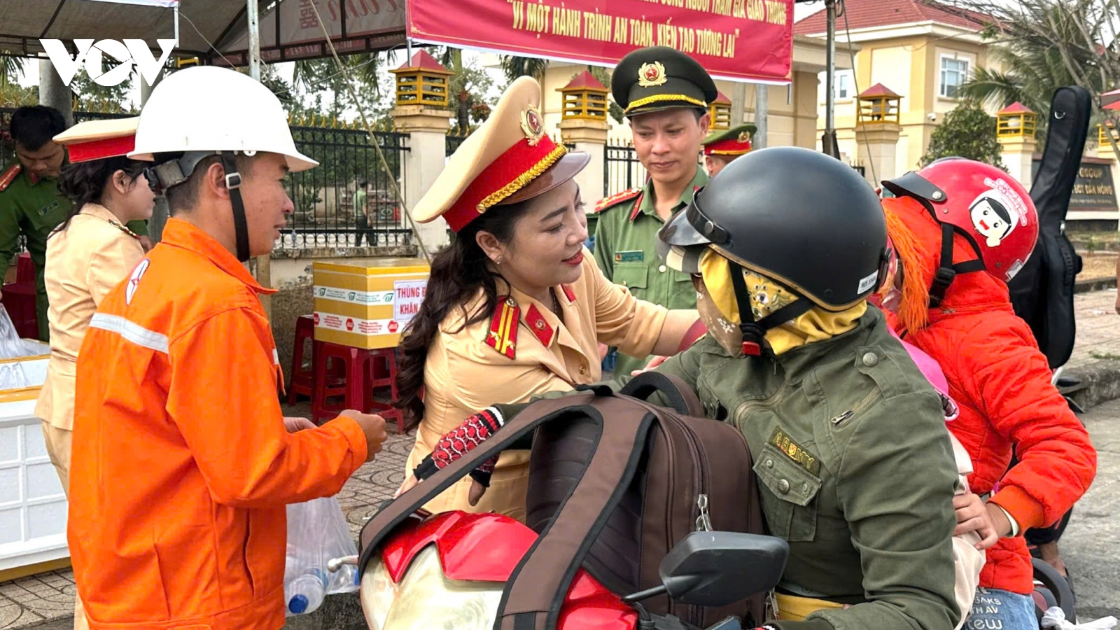 VOV.VN - Nhằm giúp người dân vơi bớt một phần khó khăn trên đường về quê đón Tết, ngày 24/1, Đội Cảnh sát Giao thông – Công an TP.HCM (PC08) phối hợp với một số đơn vị tổ chức phát tặng hàng chục ngàn chai nước suối, bánh mì, nón bảo hiểm tại những "trạm dừng chân nghĩa tình" trên các tuyến Quốc lộ thuộc địa bàn TP.HCM