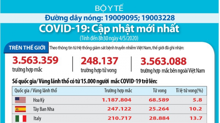 Covid-19: Thế giới hơn 3,5 triệu ca mắc, gần 250.000 ca tử vongVOV.VN - Tính đến 8h30 ngày 4/5, thế giới có 3.563.359 ca mắc và 248.137 ca tử vong vì Covid-19.
