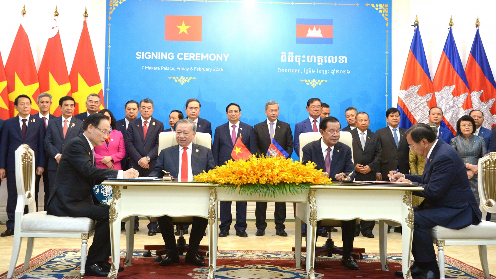VOV.VN - Trong khuôn khổ chuyến thăm cấp Nhà nước của Tổng Bí thư Tô Lâm và đoàn đại biểu cấp cao Việt Nam đến Vương quốc Campuchia theo lời mời của Quốc vương Campuchia Preah Bat Samdech Preah Boromneath Norodom Sihamoni, ngày 6/2, hai bên đã ra Tuyên bố chung giữa Việt Nam và Campuchia.