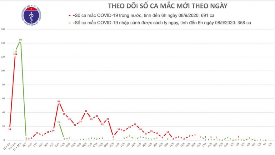 VOV.VN - Theo Bộ Y tế, đến 6h sáng 10/9, Việt Nam không ghi nhận ca mắc COVID-19 mới. có tổng cộng 691 ca mắc do lây nhiễm trong nước, trong đó số lượng ca mắc mới tính từ ngày 25/7 đến nay là 551 ca.
