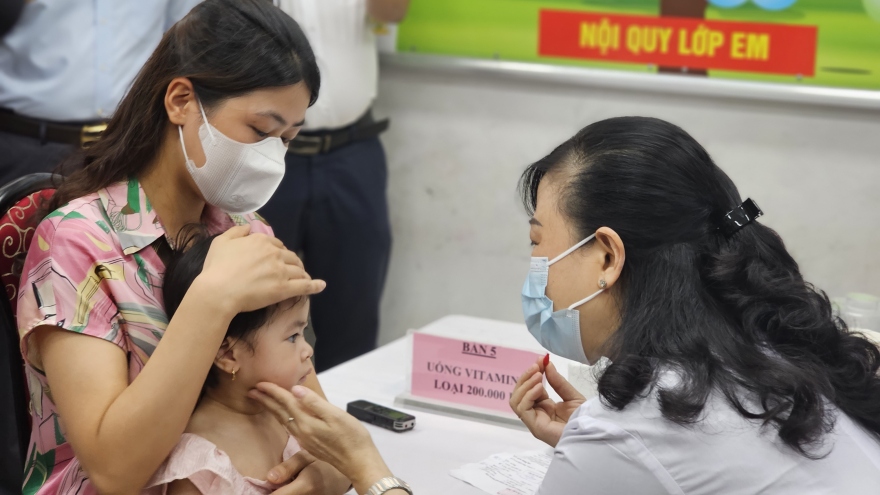 VOV.VN - Sáng 1/6, đoàn công tác của Bộ Y tế do Bộ trưởng Đào Hồng Lan làm trưởng đoàn đến thăm và kiểm tra công tác tổ chức Chiến dịch bổ sung Vitamin A cho trẻ em của thành phố Hà Nội tại điểm Trường Tiểu học Phan Chu Trinh, phường Điện Biên, quận Ba Đình, Hà Nội.
