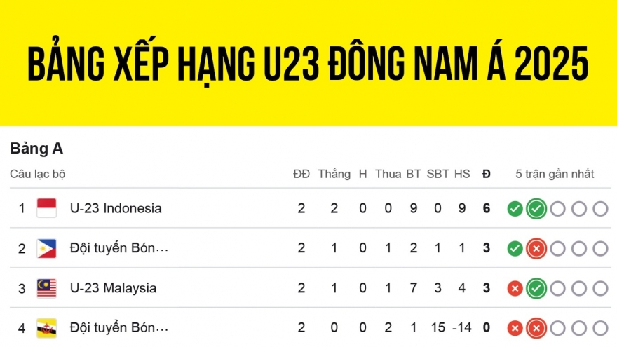 VOV.VN - Bảng xếp hạng U23 Đông Nam Á mới nhất: Sau lượt trận thứ 2 bảng A, U23 Indonesia chỉ cần giành thêm 1 điểm ở lượt cuối để đoạt vé vào bán kết. Trong khi đó, cả U23 Philippines và U23 Malaysia vẫn còn nguyên cơ hội cạnh tranh tấm vé đi tiếp.