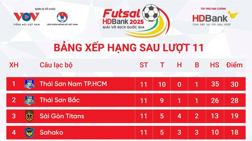 VOV.VN - Bảng xếp hạng Giải Futsal HDBank VĐQG 2025 mới nhất, Thái Sơn Nam đòi lại vị trí số một của Thái Sơn Bắc sau khi có chiến thắng trước Trẻ TP.HCM.