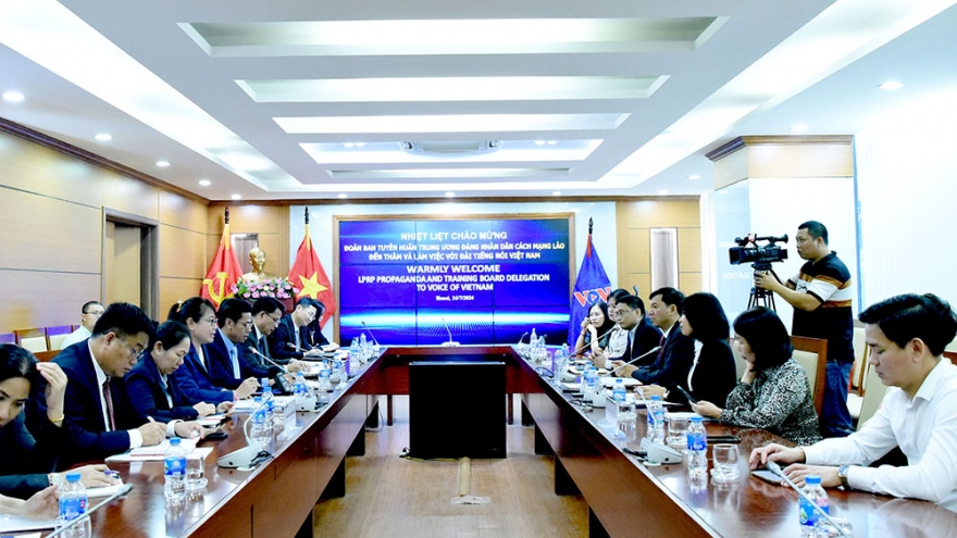 VOV.VN - Sáng 16/7, Đoàn Ban Tuyên huấn Trung ương Đảng Nhân dân Cách mạng Lào do ông Sakhone Phommalath - Phó Trưởng ban Ban Tuyên huấn Trung Ương Đảng Nhân dân Cách mạng Lào đã tới thăm và làm việc với Lãnh đạo Đài Tiếng nói Việt Nam (VOV). Phó Tổng Giám đốc VOV Ngô Minh Hiển chủ trì buổi tiếp.