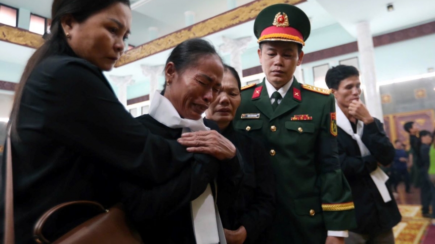 VOV.VN - Sáng 8/12, tại Nhà tang lễ Quốc gia phía Nam (quận Gò Vấp, TPHCM), Đảng ủy, Bộ Tư lệnh Quân khu 7 trang trọng tổ chức lễ tang 12 chiến sĩ thuộc Tiểu đoàn 17, Sư đoàn 5, Quân khu 7 đã anh dũng hy sinh ngày 2/12/2024 khi tham gia diễn tập.