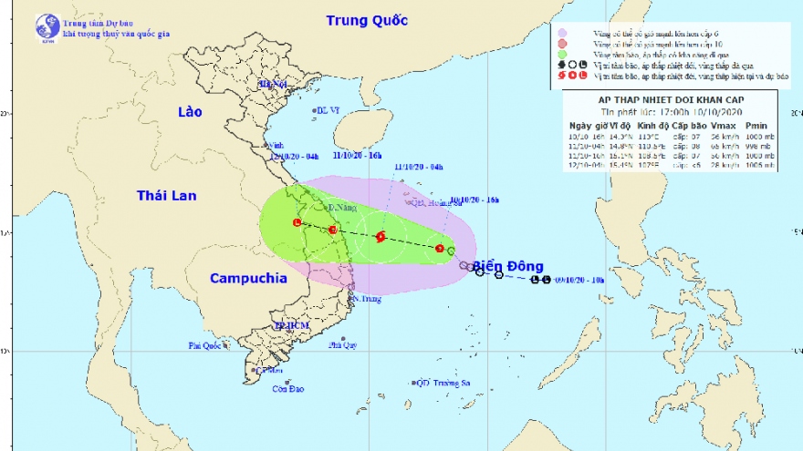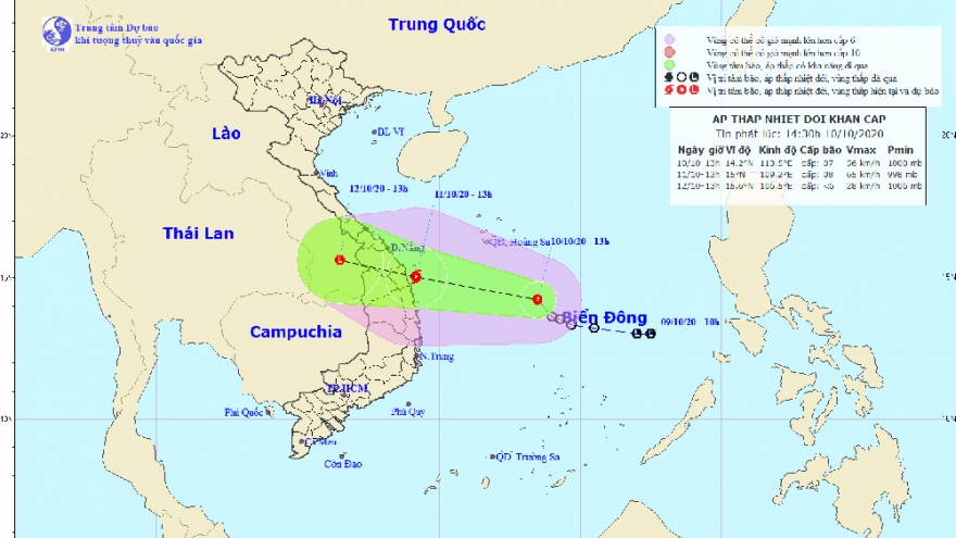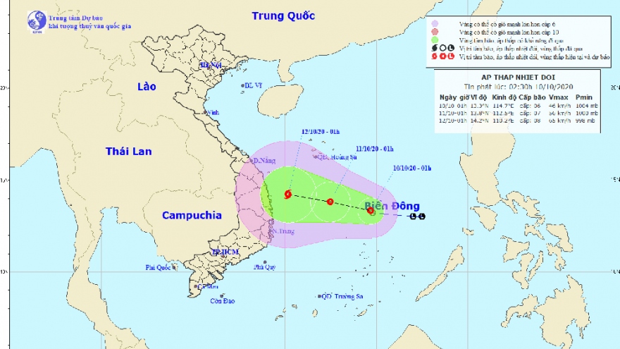 VOV.VN - Hồi 01h ngày 10/10, vị trí tâm áp thấp nhiệt đới ở vào khoảng 13,3 độ Vĩ Bắc; 114,7 độ Kinh Đông, cách đảo Song Tử Tây khoảng 230km về phía Bắc.