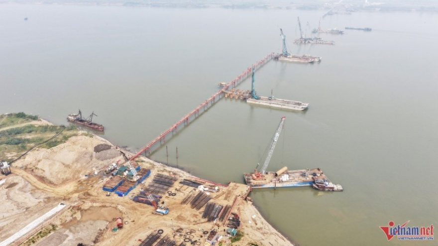 VOV.VN - Trên sông Hồng, vị trí các trụ cầu Hồng Hà đang dần lộ diện. Nhìn từ trên cao, đại công trường thi công nhộn nhịp với sà lan, cần cẩu và đường công vụ vươn dài giữa lòng sông.