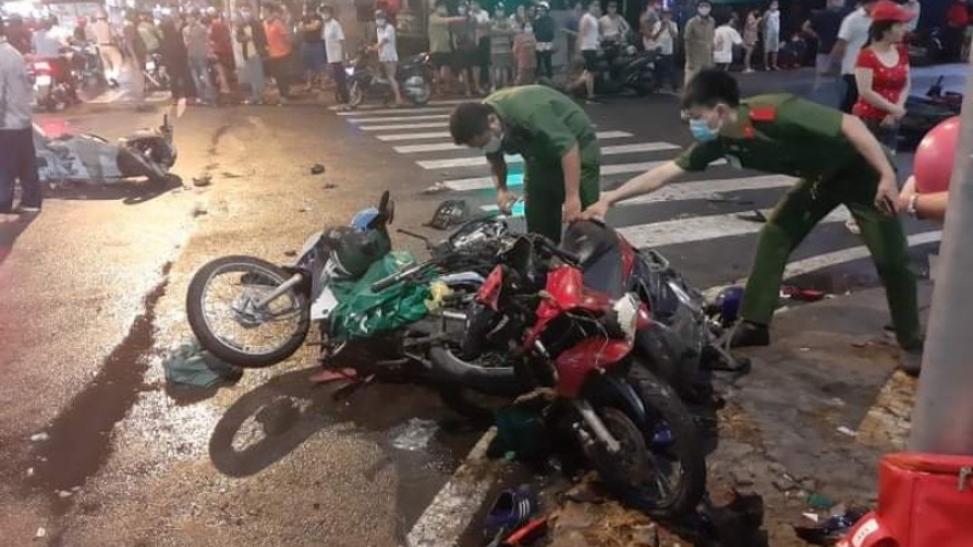 VOV.VN - Một xe đầu kéo đã va chạm liên hoàn với 7 xe máy đang đỗ để chờ đèn tín hiệu giao thông, nhiều xe máy bị xe đầu kéo húc văng, 5 người phải đi viện cấp cứu.