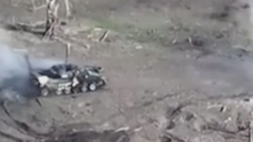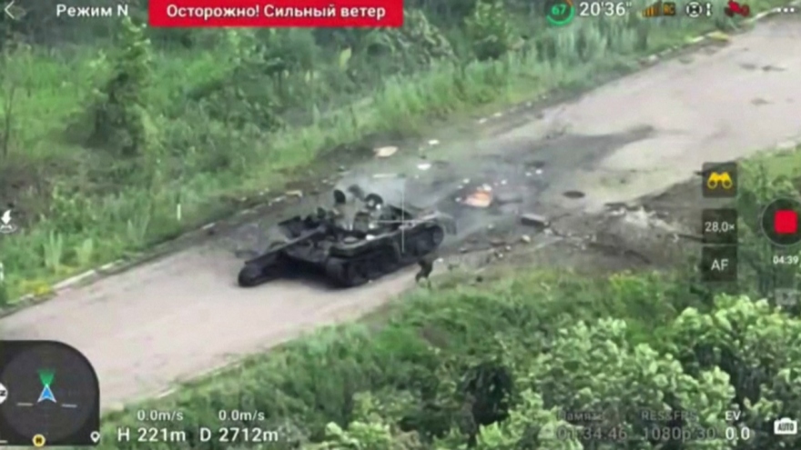 VOV.VN - Đơn vị trinh sát đường không của Ukraine ngày 2/7 đăng tải đoạn video ghi lại từ máy bay không người lái (UAV) cho thấy lực lượng nước này tấn công một xe tăng của Nga gần Bakhmut.