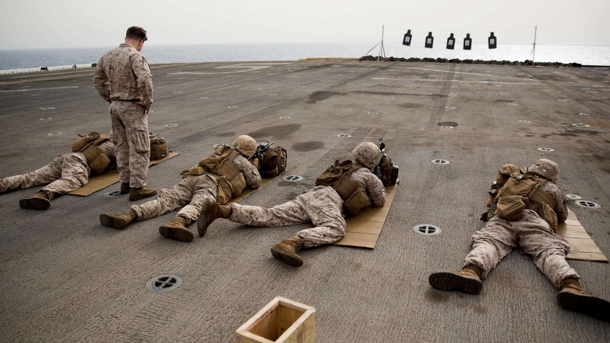 VOV.VN - Mỹ đã huy động 3 tàu chiến và 2.200 lính thủy đánh bộ tới Trung Đông ngoài 2 nhóm tác chiến tàu sân bay nhưng mục đích của Mỹ được cho là nhằm răn đe chứ không phải là tham chiến.