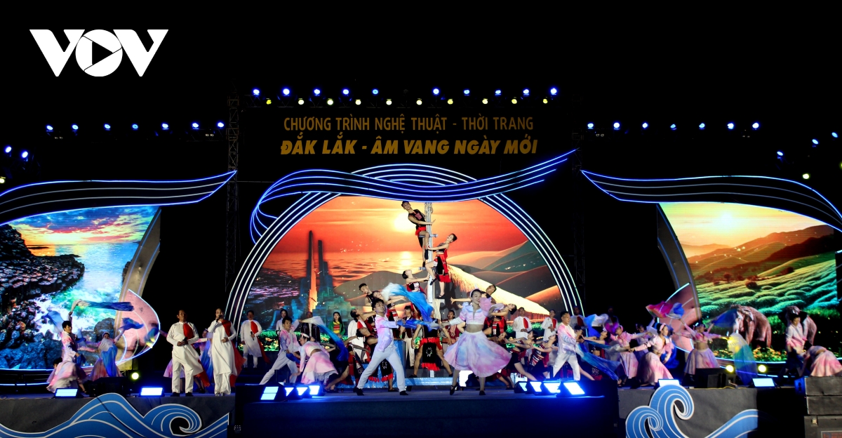 Chương trình “Đắk Lắk- Âm vang ngày mới" càng thêm phần sinh động với các tiết mục biểu diễn thời trang, gồm các bộ sưu tập áo dài, thổ cẩm, thời trang mùa hè, kết hợp nhiều chất liệu, màu sắc; trình diễn bởi những hoa hậu, người mẫu nổi tiếng của Việt Nam và Campuchia. Trong chương trình còn có sự tham gia giao lưu, trò chuyện của người đẹp Hà Trúc Linh - Hoa hậu Việt Nam 2024.