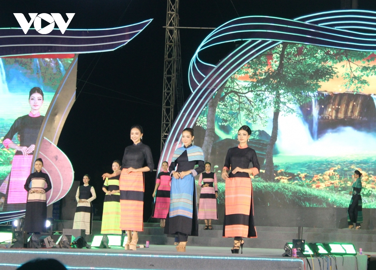 VOV.VN - Chương trình “Đắk Lắk- Âm vang ngày mới" rất sinh động với các tiết mục biểu diễn thời trang, gồm các bộ sưu tập áo dài, thổ cẩm, thời trang mùa hè, kết hợp nhiều chất liệu, màu sắc.