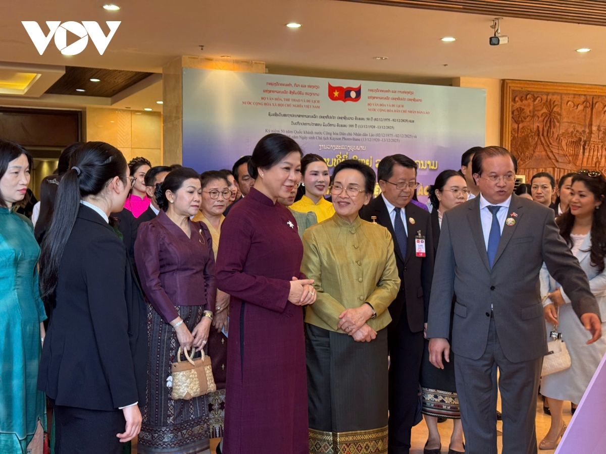 VOV.VN - Nhân dịp kỷ niệm 50 năm Quốc khánh Lào, chiều 2/12, Phu nhân Ngô Phương Ly và Phu nhân Naly Sisoulith đã tham dự khai mạc Tuần phim Việt Nam và Triển lãm ảnh quan hệ Việt Nam-Lào tại Vientiane, Lào. Đây là sự kiện do Bộ Văn hóa, Thể thao và Du lịch Việt Nam phối hợp với Bộ Văn hóa và Du lịch Lào tổ chức.