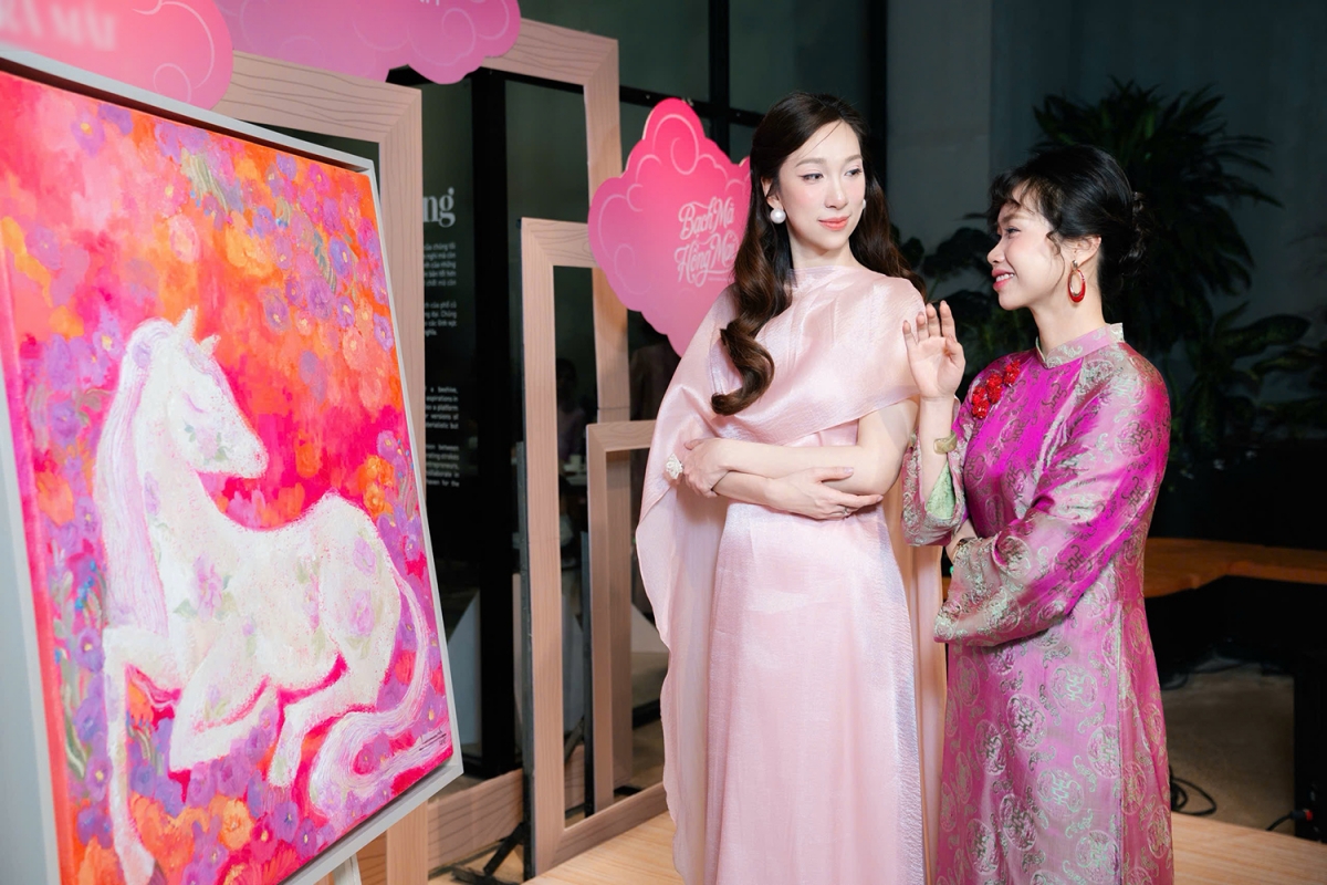 Trong tác phẩm mới nhất, Vương Linh tiếp tục gây chú ý khi chọn cách thể hiện hình tượng con ngựa theo hướng khác biệt, thậm chí “ngược số đông”. Lấy cảm hứng từ hình tượng Ngựa chín hồng mao trong truyền thuyết Sơn Tinh – Thủy Tinh, cô không đi theo lối thể hiện quen thuộc vốn thường gắn hình ảnh ngựa với tốc độ, sức mạnh chinh phục hay những biểu tượng quen như “mã đáo thành công”. Trong tác phẩm “Bạch Mã Hồng Mai”, chú ngựa xuất hiện với dáng nằm điềm tĩnh giữa không gian hoa cỏ, ánh nhìn trầm lắng, gợi cảm giác an nhiên và bền bỉ nội tại.