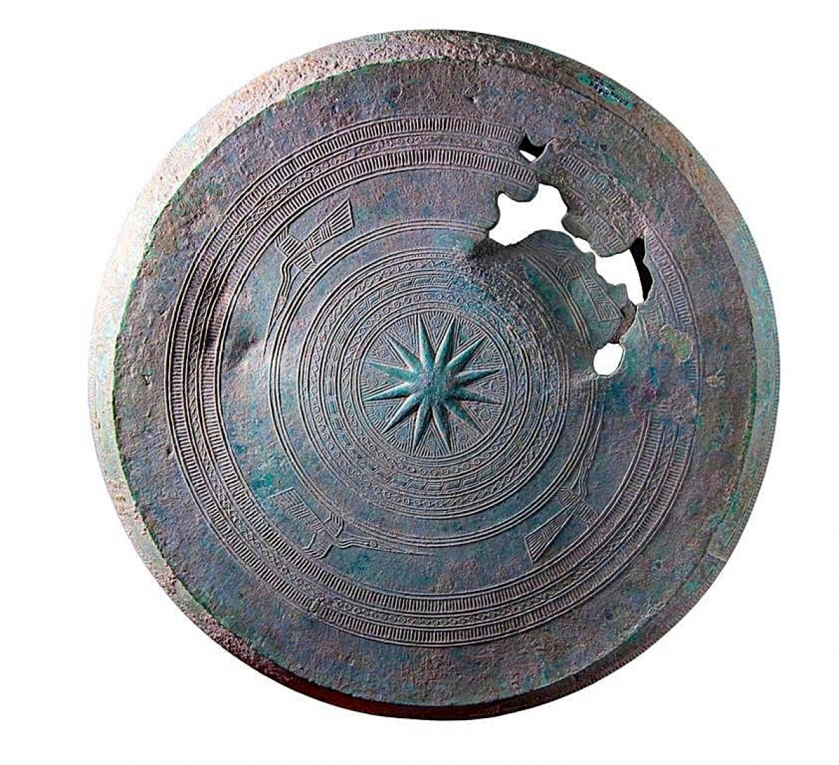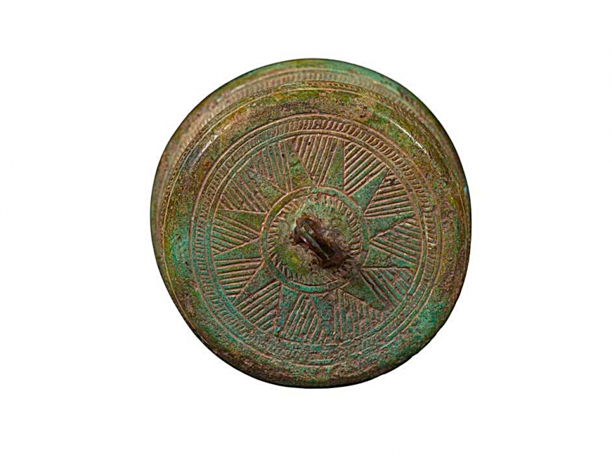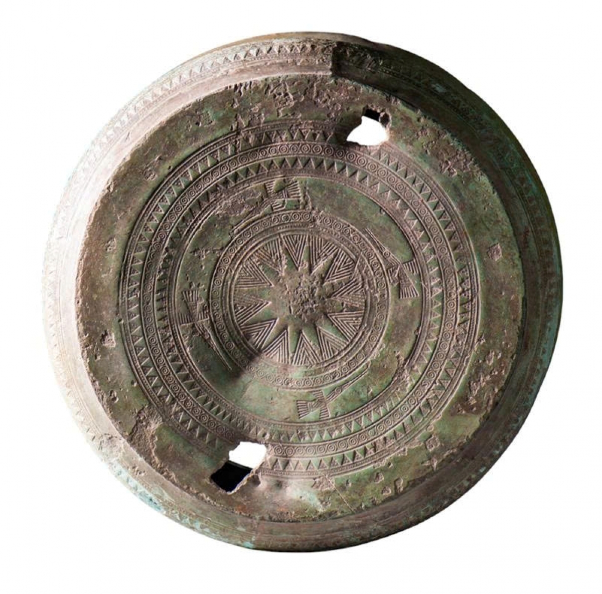 Chính giữa mặt trống là hình ngôi sao 12 cánh. Xen giữa là các cánh là hình chữ V lồng nhau hay lông công cách điệu. Tính từ trong ra ngoài, bao quanh ngôi sao trung tâm có 8 vành hoa văn: vành 1, 4, 8 là những hàng chấm nổi; vành 2, 6 là hoa văn vòng tròn kép có chấm nổi ở giữa; vành 5, 7 là hoa văn răng cưa, xen giữa có 3 chấm nổi. (Ảnh: Bảo tàng Nghệ An cung cấp).