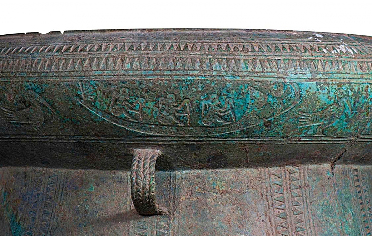 Tang trống có 3 băng hoa văn, chia làm hai phần trên dưới. Phần trên là 2 băng răng cưa ngược chiều nhau, ngăn cách bởi một đường chỉ nổi. Phần dưới là băng hoa văn chủ đạo, trang trí hình thuyền và chim xen kẽ. Có bốn chiếc thuyền bơi theo hướng ngược chiều kim đồng hồ, thân thuyền cong, có những chấm nổi nhỏ. Đuôi thuyền xòe ra hình nan quạt. (Ảnh: Bảo tàng Nghệ An cung cấp).