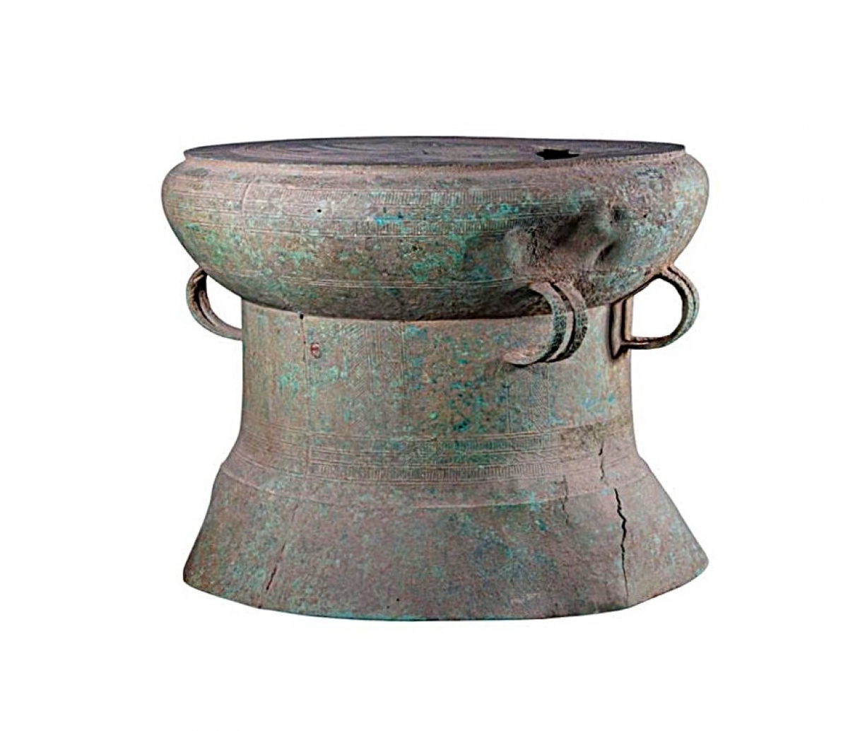Trống Làng Vạc III, thuộc dòng trống thấp lưng choãi, với tang phình, lưng hình nón cụt choãi dần xuống dưới. Trống có 2 đôi quai bố trí ở hai bên thân, mỗi quai được trang trí hai hàng hoa văn bông lúa. Pa tin màu xanh rỉ đồng. (Ảnh: Bảo tàng Nghệ An cung cấp).