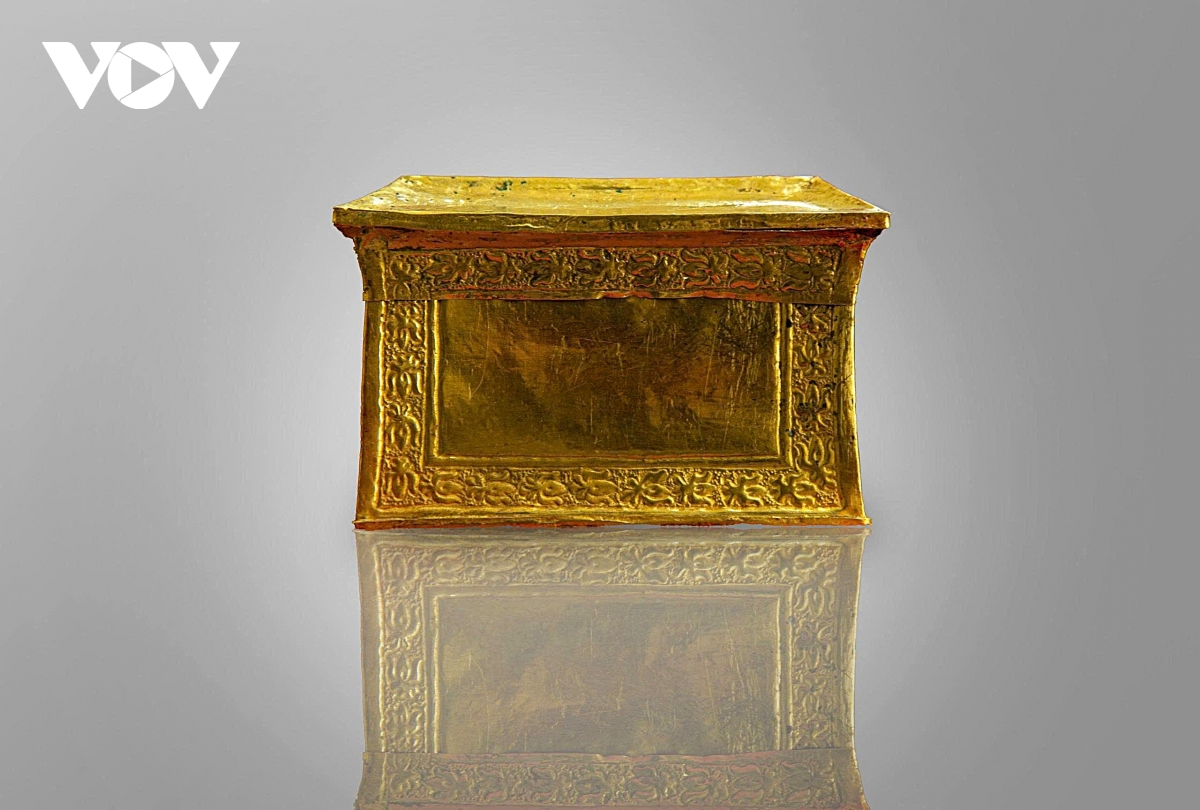 Tháng 12/2017, hộp xá lị được công nhận là bảo vật quốc gia. Theo tài liệu, hộp xá lị có chất liệu kim loại màu vàng đựng xá lị nặng 100 gram, dài 8cm, rộng 5cm, cao 5,5cm, được chia thành hai phần nắp và thân hộp. Nắp hộp ở bốn rìa cạnh hơi lõm xuống, nhìn tựa như rìa mái nhà. (Ảnh: Hải Chi).