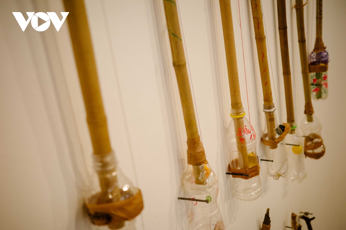 Những chiếc chai nhựa cũ được khoét, buộc dây và biến thành nhạc cụ gõ độc đáo.